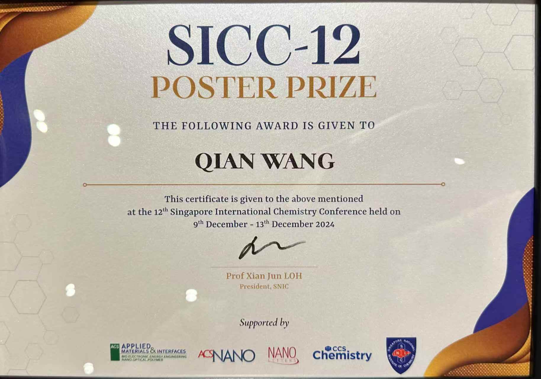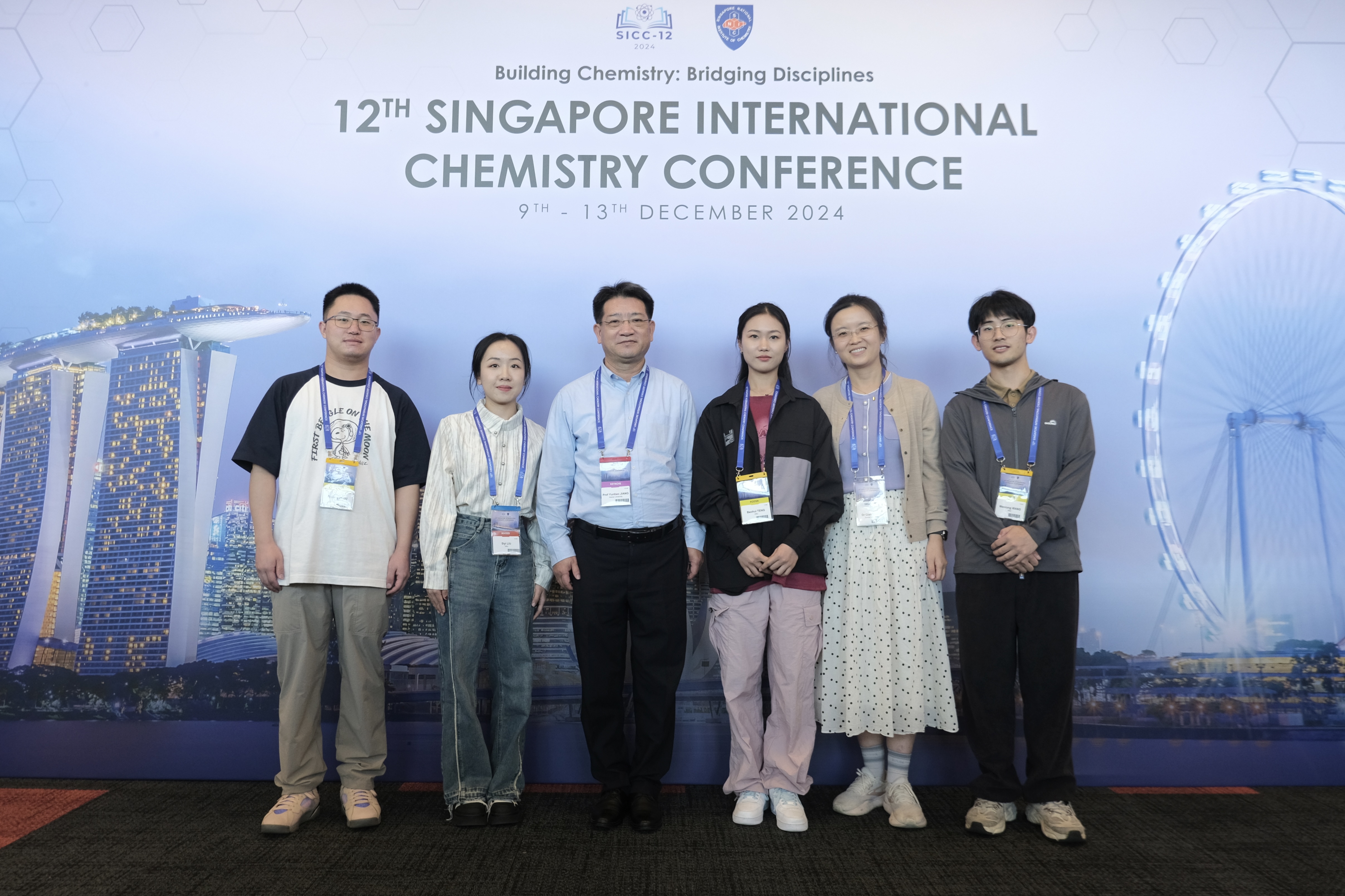 实验室两位老师、两位博士生和两位硕士生参加了12月9日-13日于新加坡召开的第十二届新加坡国际化学会会议 (SICC-12)。江云宝教授应邀作Keynote报告 (Peptidomacrocycles: Recognition and transportation),博士生刘思奕作10分钟口头报告;王茜博士获得大会墙报奖 (2024.12.13)